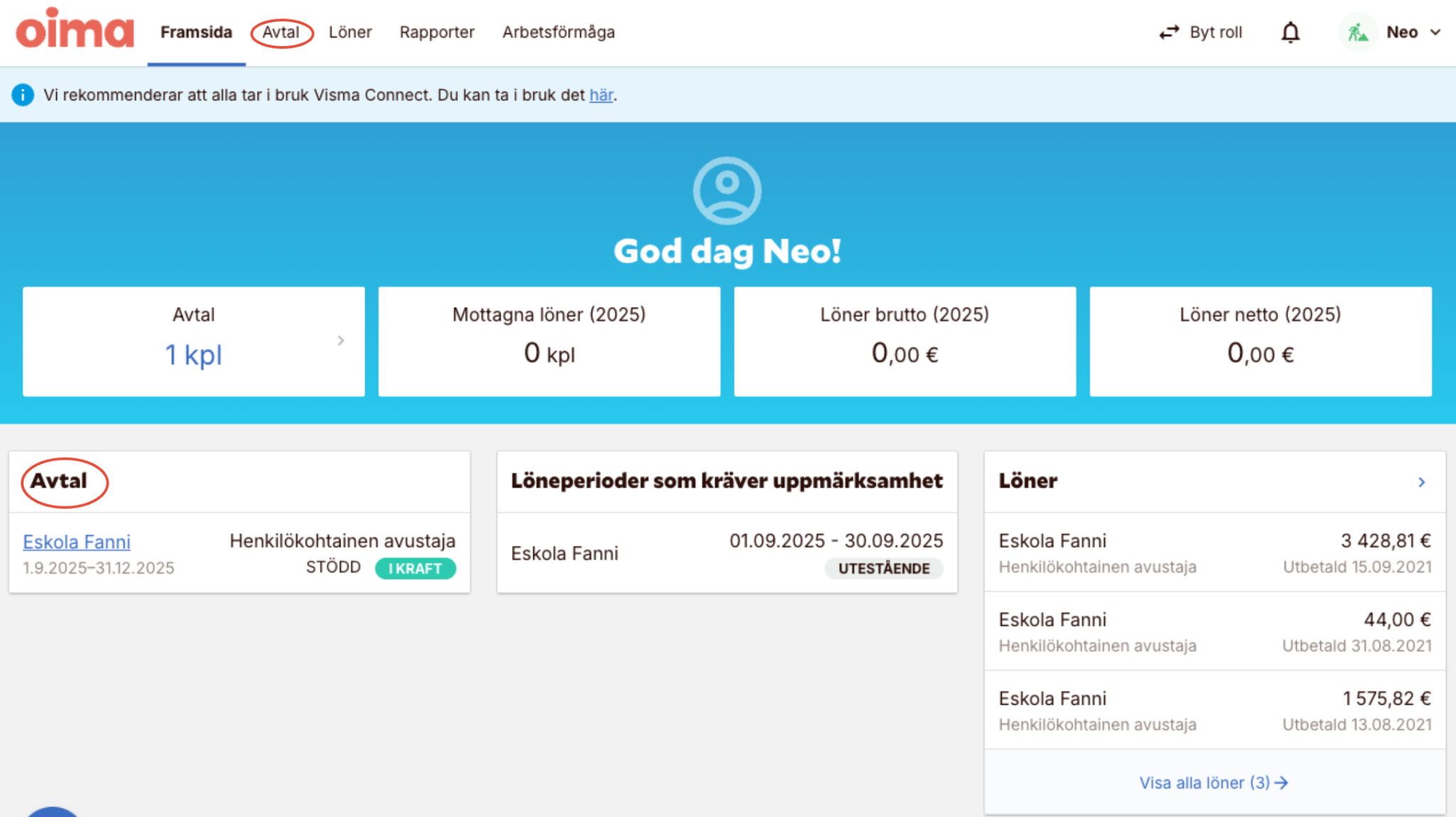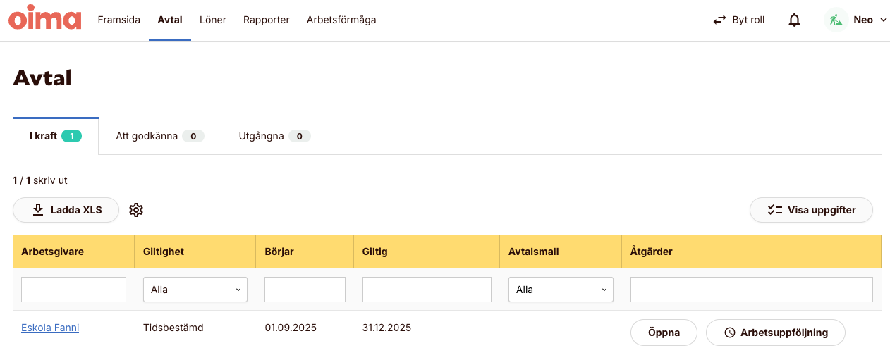 Bild av tjänstens hemsida där arbetsavtalen visas, löneperioder som kräver uppmärksamhet och utbetalda löner. Bild av arbetsavtalsmenyn.