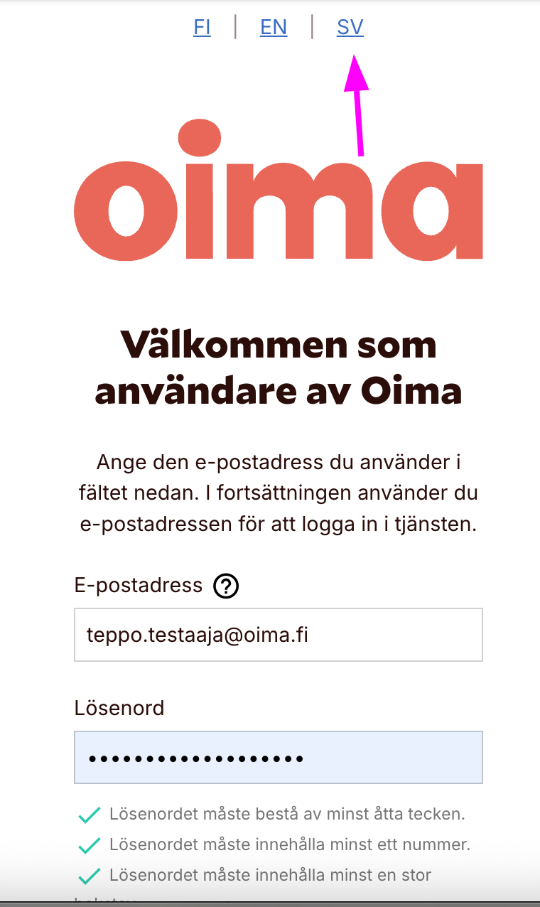 Skapa konto och logga in i Oima-tjänsten som ny användare