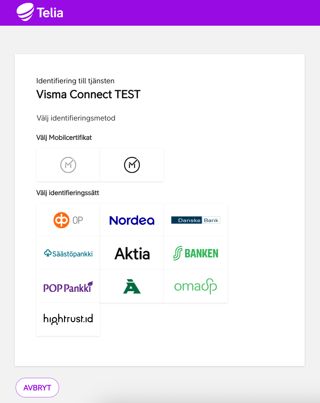 Därefter går du vidare till stark autentisering. Den görs antingen med mobilcertifikat eller via nätbanken. Om du använder nätbanken, välj i bilden vilken banks koder du vill använda.