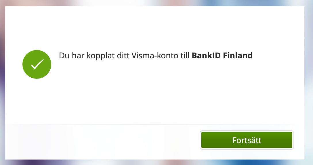 Därefter visas ett meddelande i tjänsten (se Bild 5) som bekräftar att du är starkt autentiserad. På skärmen visas texten BankID Finland länkat till ditt Visma-konto. Klicka sedan på knappen Fortsätt.