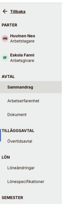 Från arbetsavtalet kan du granska avtalets sammanfattning och andra uppgifter på egna flikar.