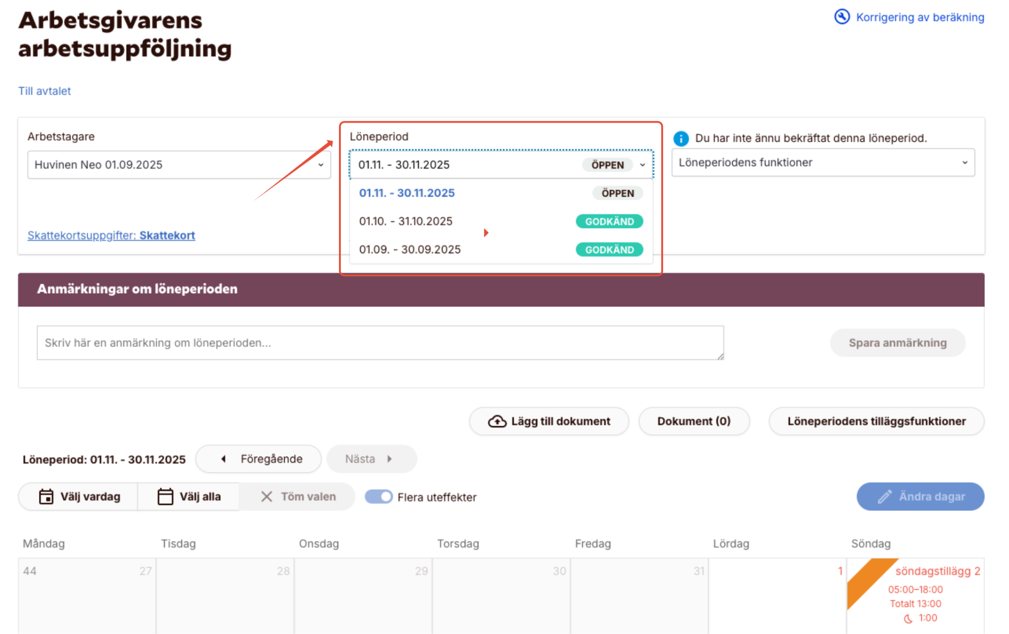 Löneperioderna öppnas i en rullgardinsmeny i arbetstidsuppföljningen.