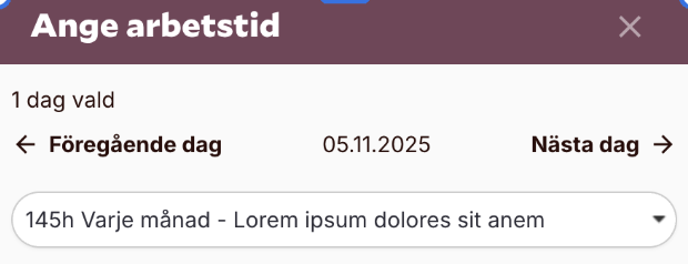 När du klickar på Spara och stäng visas arbetspasset i kalendern. Du kan också välja Spara och nästa för att direkt fylla i följande dag.
