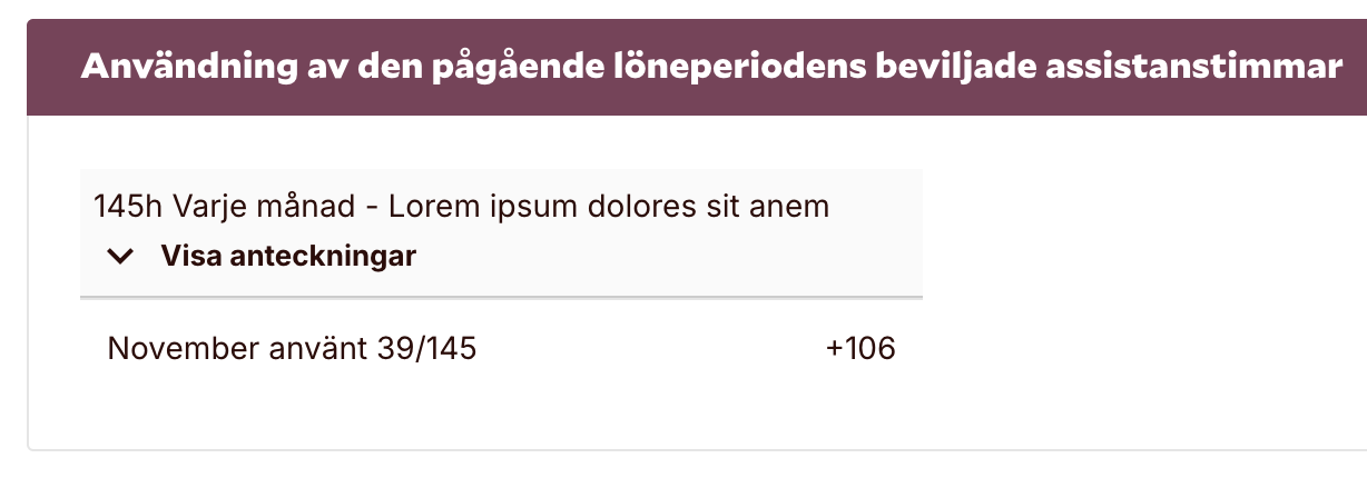 Användningen av beviljade assistanstimmar kan följas längst ned i arbetstidsuppföljningen.
