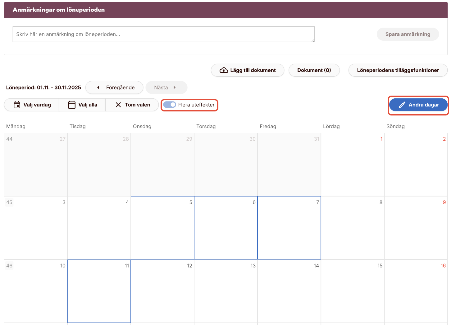 Om du vill kan du välja Välj vardagar, Välj alla dagar eller markera dagar manuellt när flerinmatningen är aktiv, och sedan registrera arbetspasset på de markerade dagarna med en enda registrering genom att klicka på Redigera dagar.
