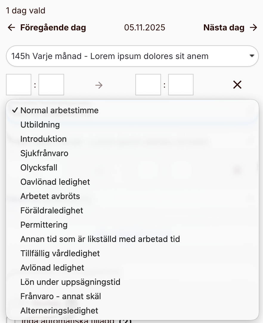 Bild från flerinmatningsvalet i arbetstidsuppföljningen.